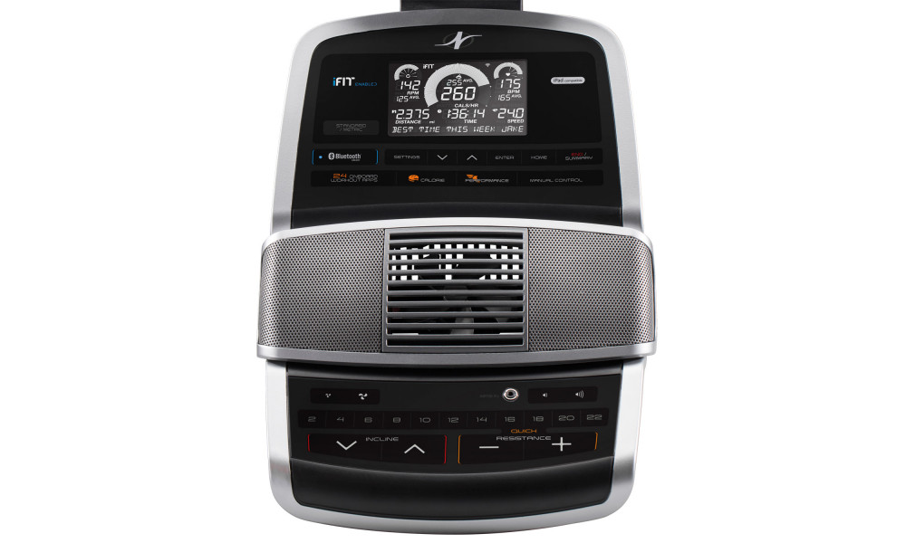 Домашний эллиптический тренажер с классическим заднеприводным расположением маховика весом 8 кг и длиной шага 46 см. 22 уровня бесшумного магнитного сопротивления с электронной регулировкой, 24 встроенные программы. Встроенный вентилятор AutoBreeze™ с ручной и автоматической регулировкой, чтобы провести тренировку в комфортных условиях. Изменение угла наклона до 10 градусов с помощью кнопки на консоли тренажера позволит лучше прокачать ваши квадрицепсы, игры и ягодицы. Сенсорные датчики пульса Dual EKG™ Grips расположены на рукоятках. Точность показаний частоты сердечных сокращений обеспечивается нагрудным датчиком Bluetooth Smart® (опция, приобретается отдельно). После тренировки вы можете хранить тренажер и экономить жизненное пространство благодаря удобному дизайну space saver и транспортировочным роликам. Он настолько компактен, что его можно хранить в шкафу или в любом уголке вашего дома. Совместимость с iFit® Coach Ready позволит путешествовать во время тренировки. Побывать в Париже, пробежаться в Швейцарских Альпах или по побережью в Чили возможно с помощью маршрутов Google Maps™. Вы можете настроить собственные тренировки с неограниченным количеством программ, разработанных сертфицированными тренерами. Библиотека тренировок постоянно дополняется. Тренажер поставляется в коробке в пред-собранном виде и его подготовка к тренировке занимает несколько минут. Дисплей размером 5" с звуковой системой и возможностью подключения iPod®. Большие педали с рифленным амортизирующим покрытием. Держатель для бутылки и планшета.